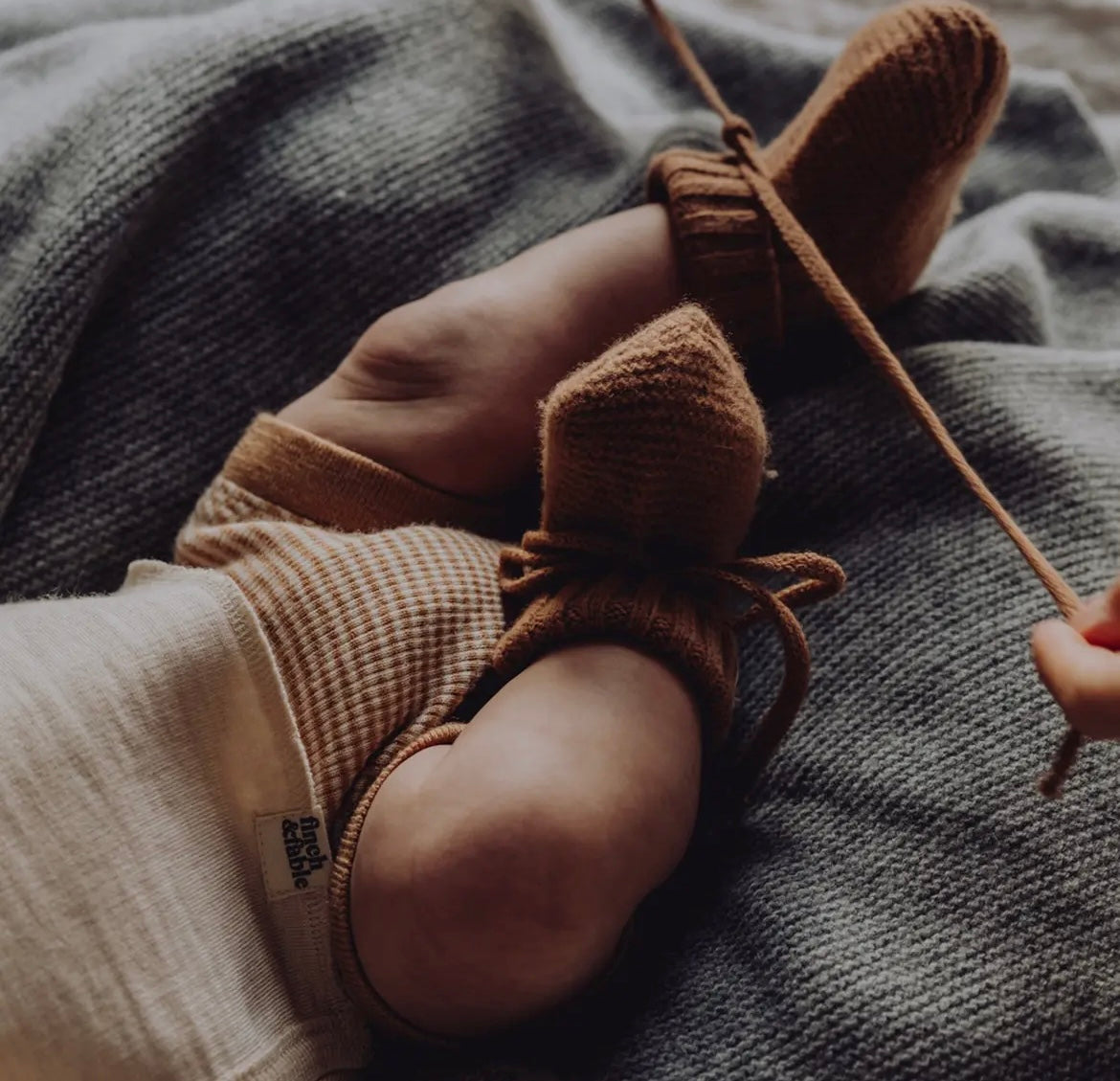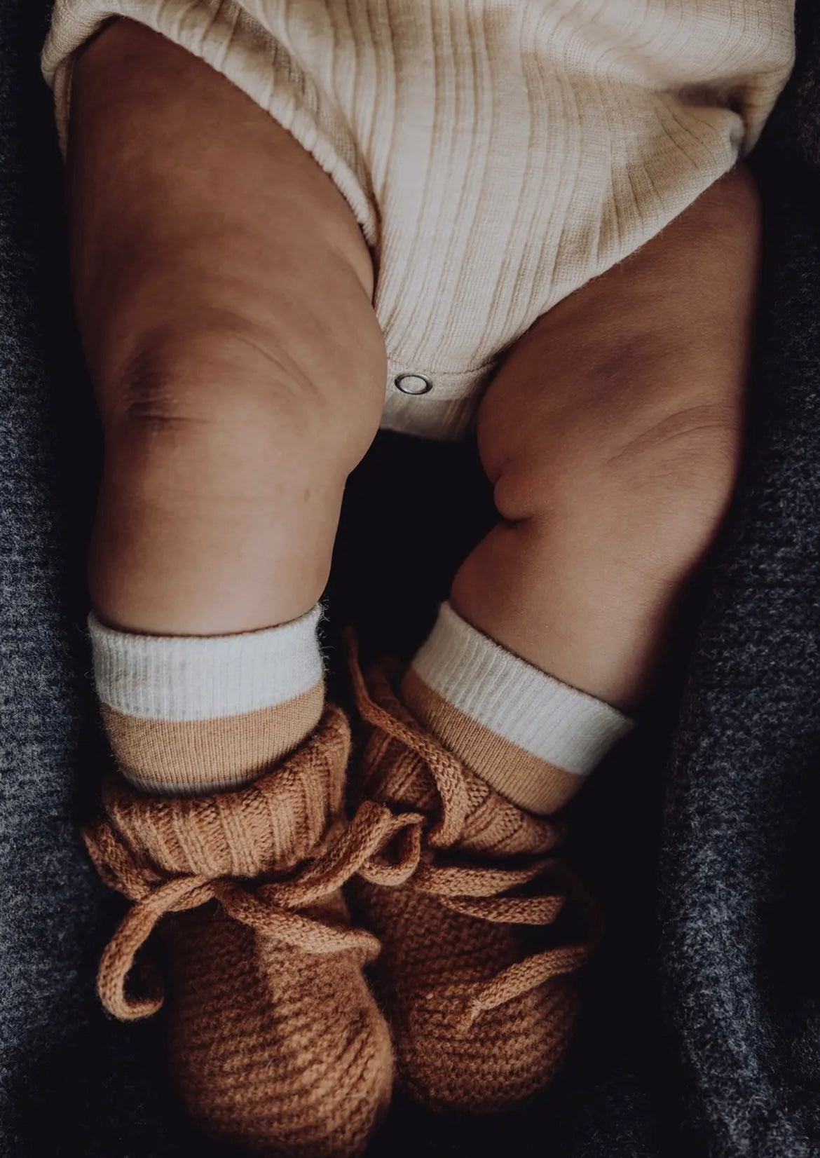 De sødeste små sko/futter til små fødder! Strikkede babyfutter lavet af det blødeste uld-bambus blandingsgarn. De har en bred ribkant, som kan foldes ned for at holde benene dækket og de små tæer varme og hyggelige. Perfekt som gave til babyshower eller nyfødte. Passer cirka størrelse 0–12 måneder.