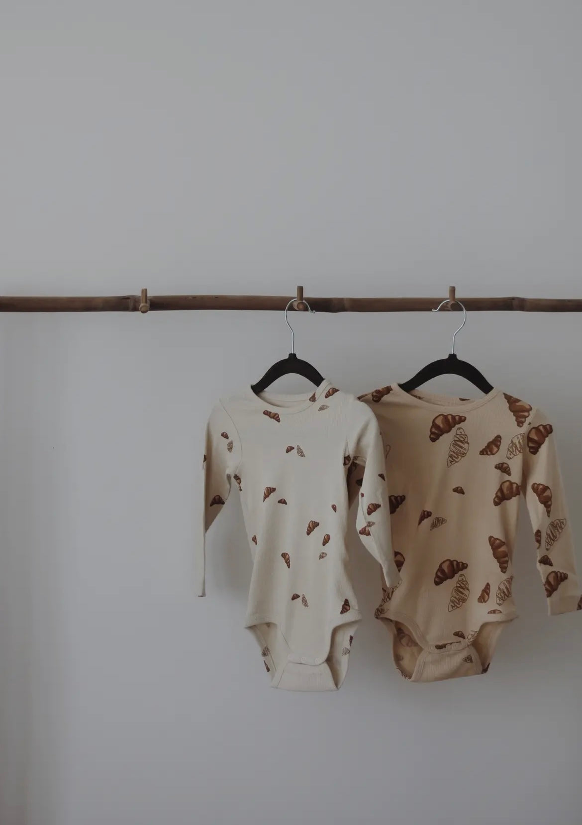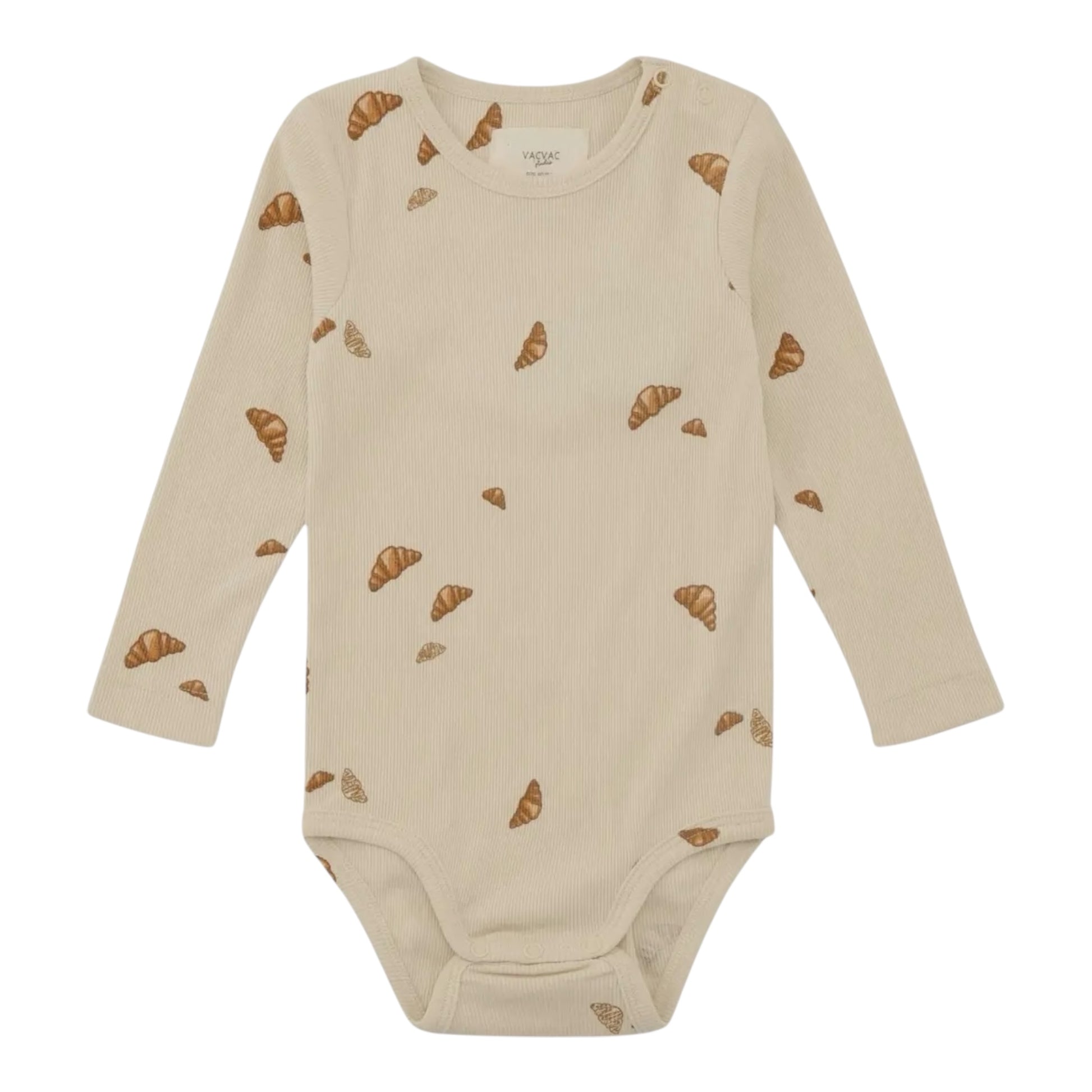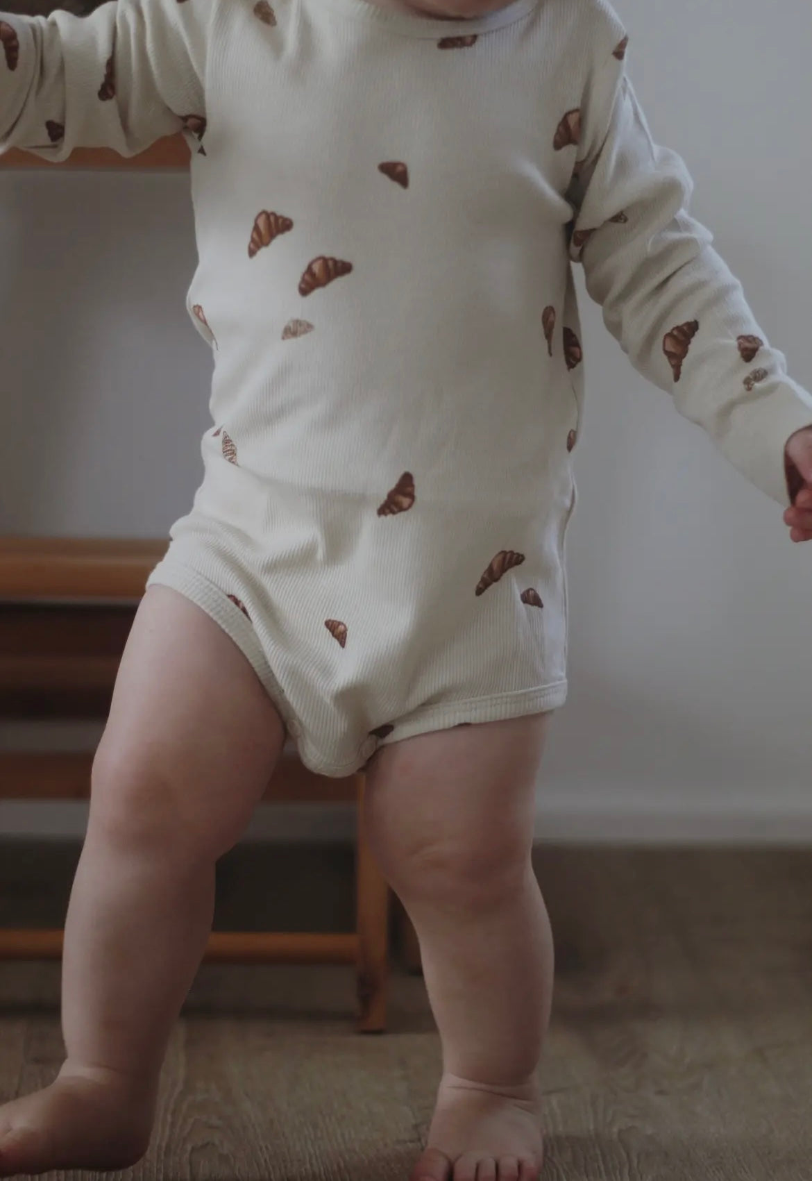 KURT bodystocking er syet i ekstra bløde ribkvalitet med et sødt croissant-print. Den er designet med praktiske trykknapper på venstre skuldersøm og forneden, så påklædning bliver let og hurtig.