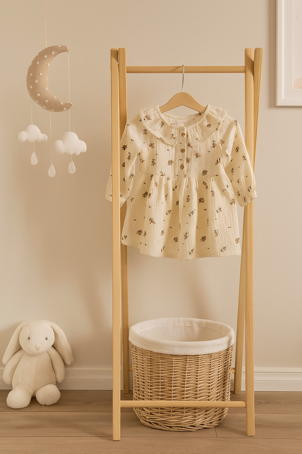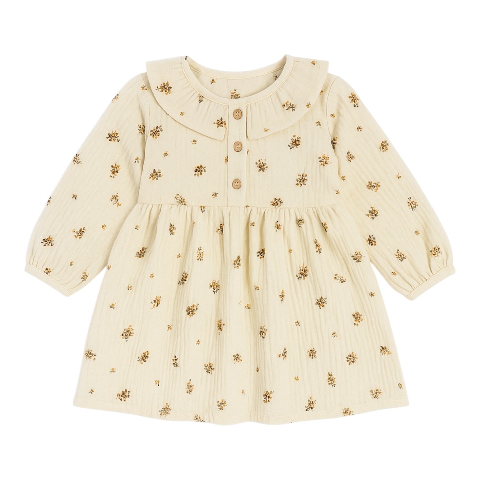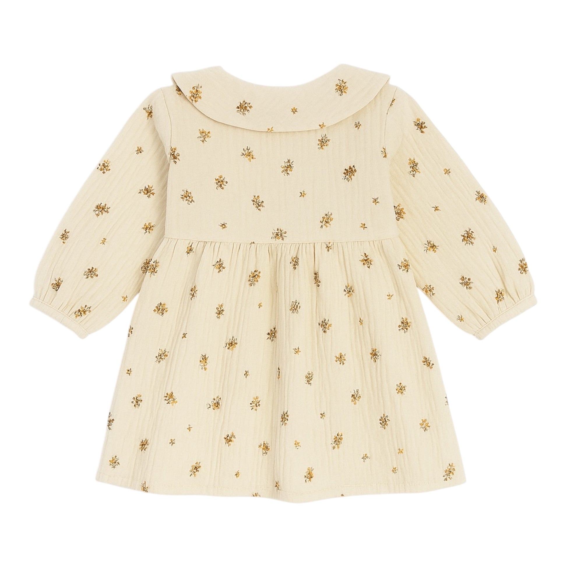 En tidløs og blød kjole i 100% bomuldsgaze – perfekt til både hverdag og særlige lejligheder. Kjolen har et let og luftigt stof, der føles behageligt mod huden og giver god bevægelsesfrihed. De tre små træknapper foran og den fine Peter Pan-krave tilføjer et klassisk, nostalgisk udtryk, mens det diskrete blomsterprint giver et charmerende og naturligt look.