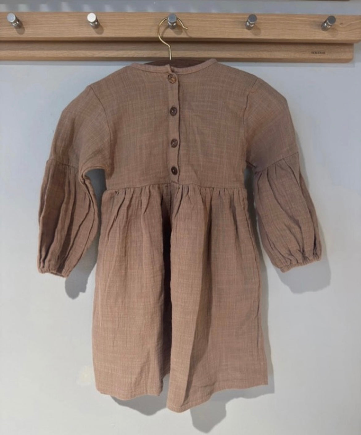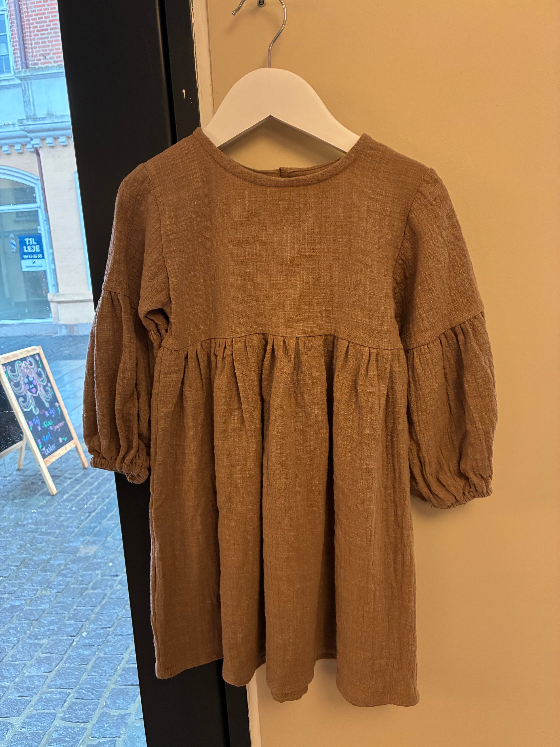 En smuk og enkel kjole i økologisk, blødt musselin – perfekt til efterårets hyggelige dage. Kjolen er designet med lange ærmer, en løs pasform og et elegant fald, der giver masser af bevægelsesfrihed. Bagpå finder du fire smukke træknapper, som både tilføjer et naturligt og klassisk udtryk og gør kjolen nem at tage af og på.