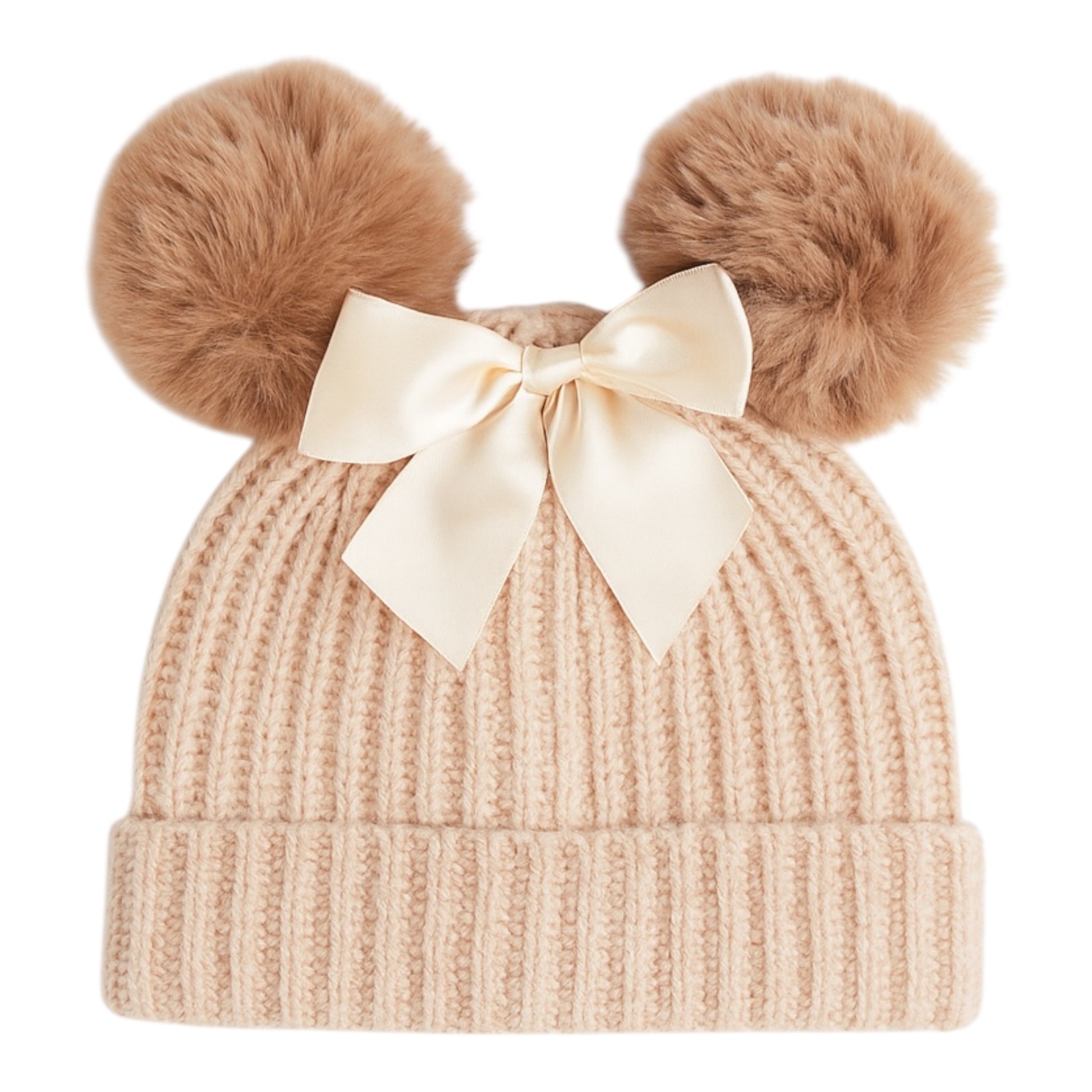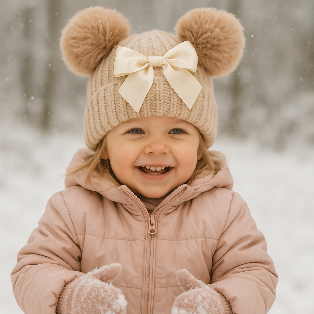 Sød lille strikhue med pompons og fin satinsløjfe.